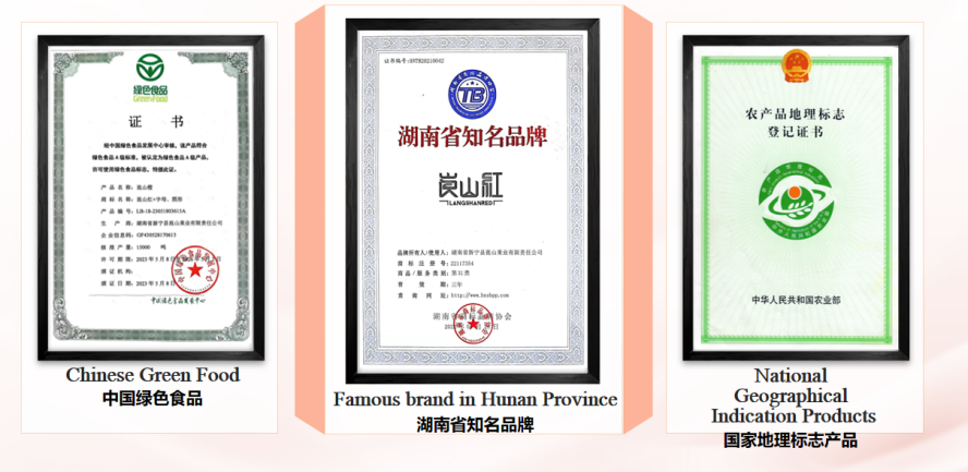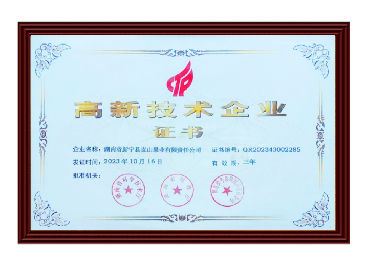 公司擁有標準化臍橙種植基地1萬多畝,年產優(yōu)質臍橙1.5萬噸;擁有全省最大的臍橙恒溫保鮮庫和常溫儲藏庫;兩條全自動智能化生產線,日加工量超200噸。公司產品先后榮獲中國綠色食品、湖南省知名品牌、農博會金獎、世博會金獎等眾多榮譽,是國家地理標志產品,2023年公司通過食品安全、質量、環(huán)境、職業(yè)健康4大管理體系認證。