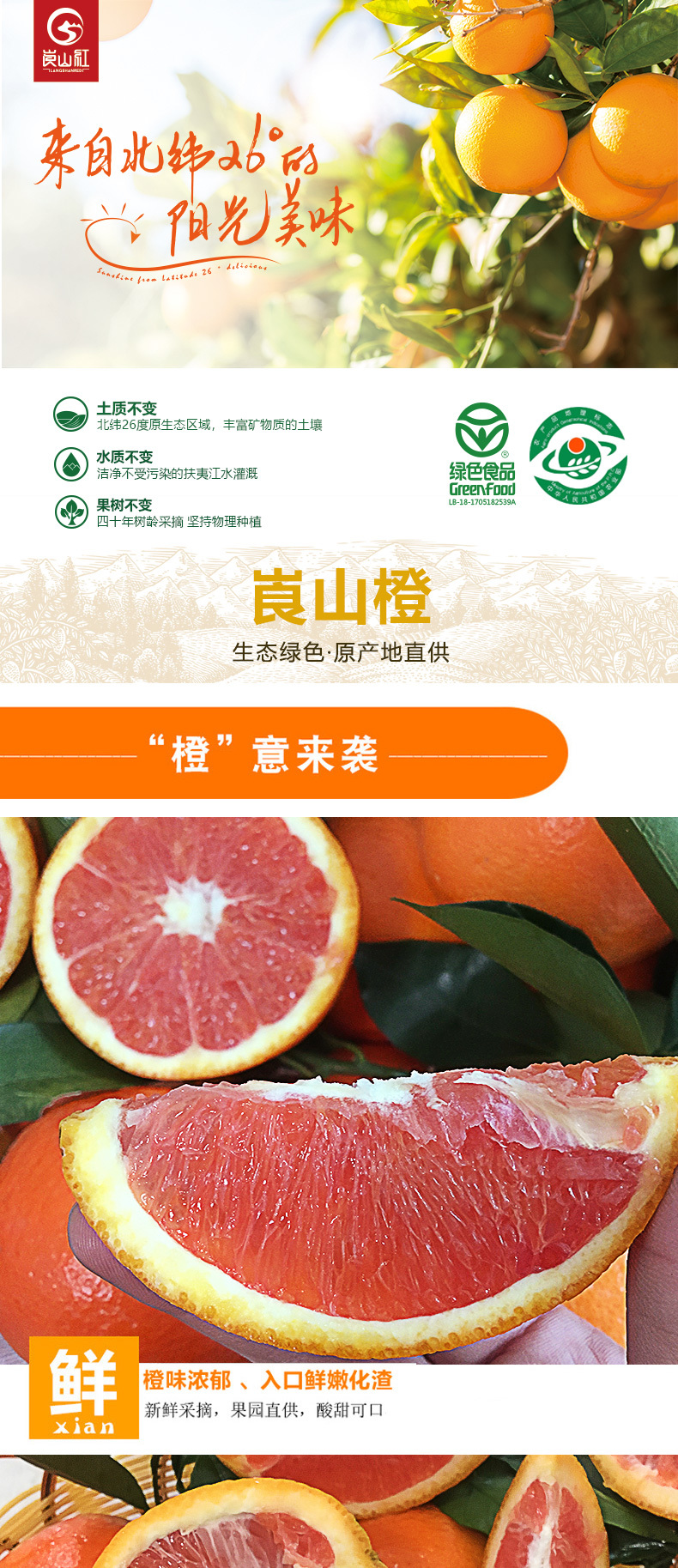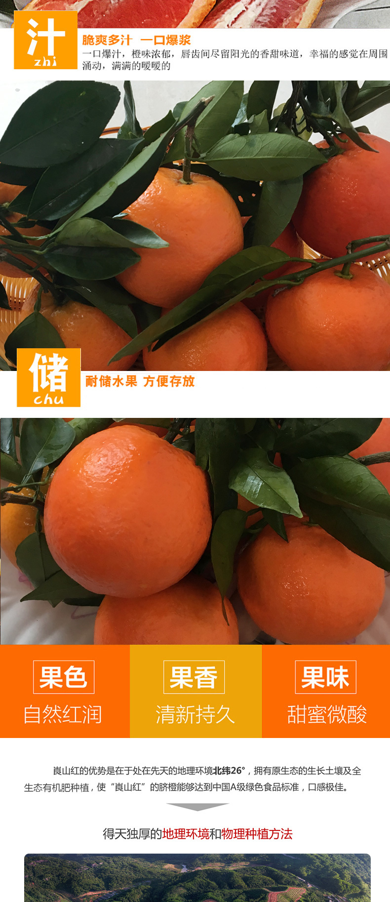 新寧崀山臍橙色澤橙紅,果面細膩,風(fēng)味濃甜,汁胞細嫩,富有香氣,品質(zhì)上等 ,鮮食極佳,耐貯藏運輸,貨架壽命長,營養(yǎng)豐富,具保健作用,達A級綠色食品標(biāo)準(zhǔn),湖南著名農(nóng)產(chǎn)品,中國國家地理標(biāo)志保護產(chǎn)品。